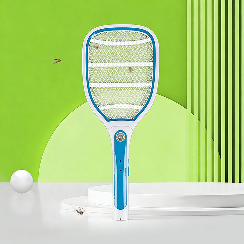 This product is a multi-functional high-voltage electric mosquito swatter integrating a three-color LED lighting/indication system, a 400mAh lead-acid rechargeable battery, and a direct-plug charging interface. The three-color LEDs perform three core functions: the red LED is a charging/fault indicator, which stays on while charging and turns off or green when fully charged, and flashes to remind the user when the battery is low to avoid overcharging or discharging and damaging the battery; the green LED is a working status indicator, which lights up when the mosquito-killing high-voltage mesh is turned on, intuitively indicating that the device is in working status and preventing accidental activation; the blue/yellow LED is an auxiliary lighting/mosquito-attracting lamp, which uses a high-brightness, low-power chip and can be used as a temporary flashlight at night. At the same time, it utilizes the phototaxis of mosquitoes to help attract mosquitoes to the mesh surface, improving mosquito-killing efficiency. The LED system uses a constant current drive circuit, with the operating current of a single LED controlled at 10-20mA and power consumption below 0.5W, ensuring brightness without consuming additional battery power. The LED module is integrated into the front of the handle, physically isolated from the high-voltage grid area, and avoids high-voltage interference through insulation and sealing treatment. It also has IPX4 waterproof and splashproof capabilities, making it suitable for use in humid environments.